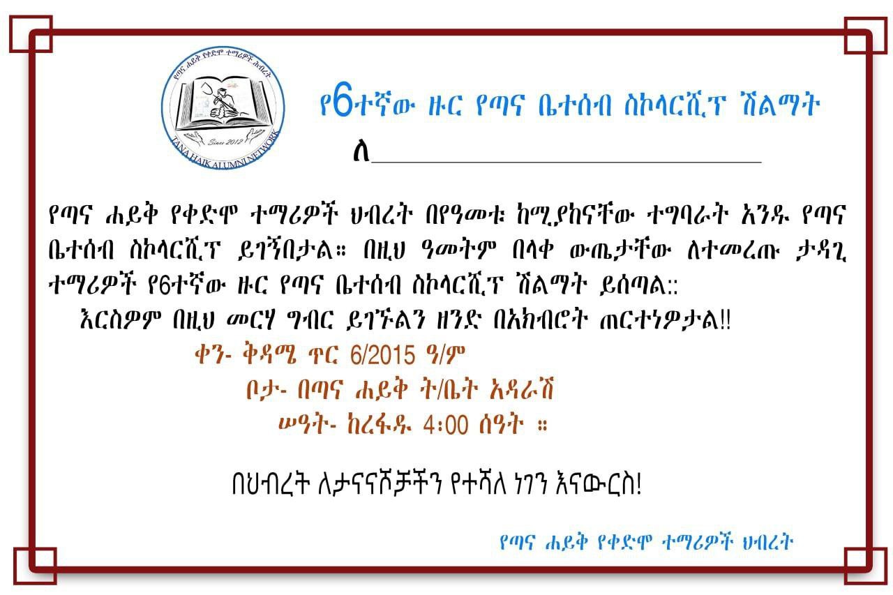 እርስዎም ይህን የስድስተኛው ዙር የጣና ቤተሰብ ስኮላርሺፕ አሸናፊዎች ሽልማት በምንሰጥበት ቀን ቅዳሜ ጥር 6/2015 ዓ/ም በጣና ሐይቅ ትምህርት ቤት አዳራሽ ከረፋዱ 4፡00 ሰዓት እንዲገኙልን በአክብሮት ጠርተነዎታል።